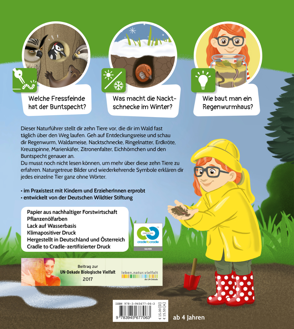 Dieser einzigartige Naturfüherer stellt zehn Waldtiere vor, die Kindern am häufigsten begegen und kommt dabei fast ohne Wörter aus. Anhand von wiederkehrenden Symbolen werden beispielsweise Lebensraum, Nahrung und Fressfeinde gezeigt oder erklärt, was die Tiere in den unterschiedlichen Jahreszeiten machen.
