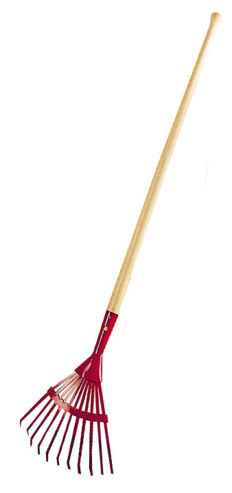 Ein hochwertiger und stabiler Laubrechen für Kinder mit 11 Zinken aus lackiertem Metall und einem 70cm langen Holzstiel.