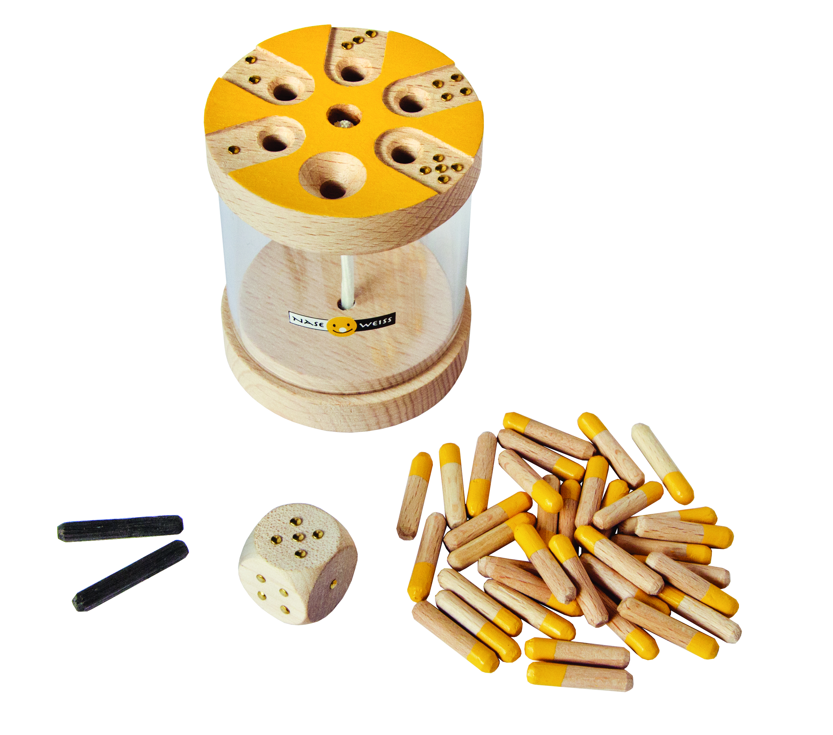 Dieses  Spiel ist bestens für sehbehinderte und blinde Spieler geeignet, da die Zahlen am Würfel und der Dose erhaben sind.