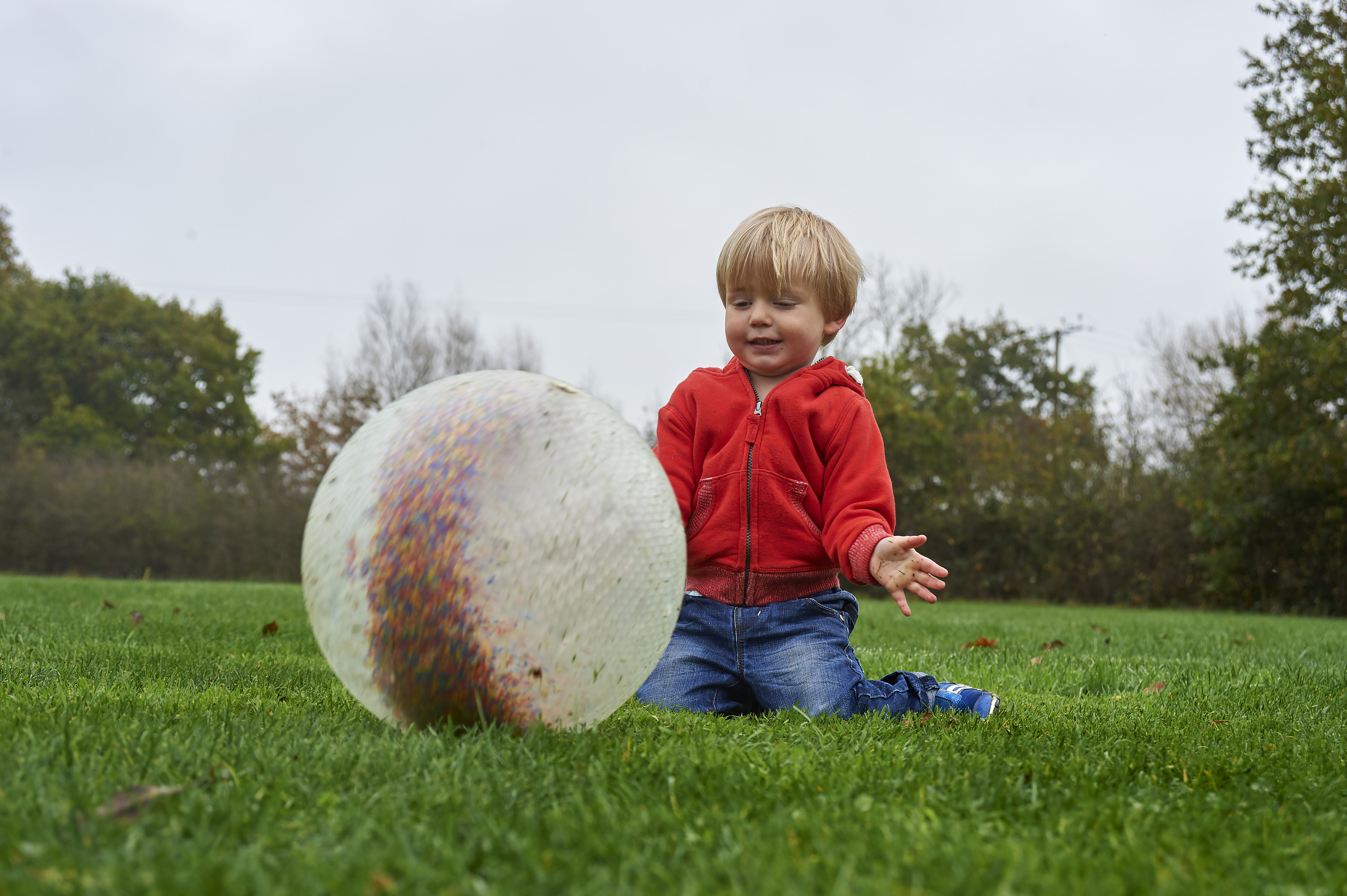 Der Ball hat an der Oberfläche eine besondere Struktur und ist mit vielen kleinen, bunten Plastikperlen gefüllt, die sich beim Rollen des Balles bewegen, lustige Geräusche machen und somit taktiel, visuell und akustisch beim Spiel anregen.