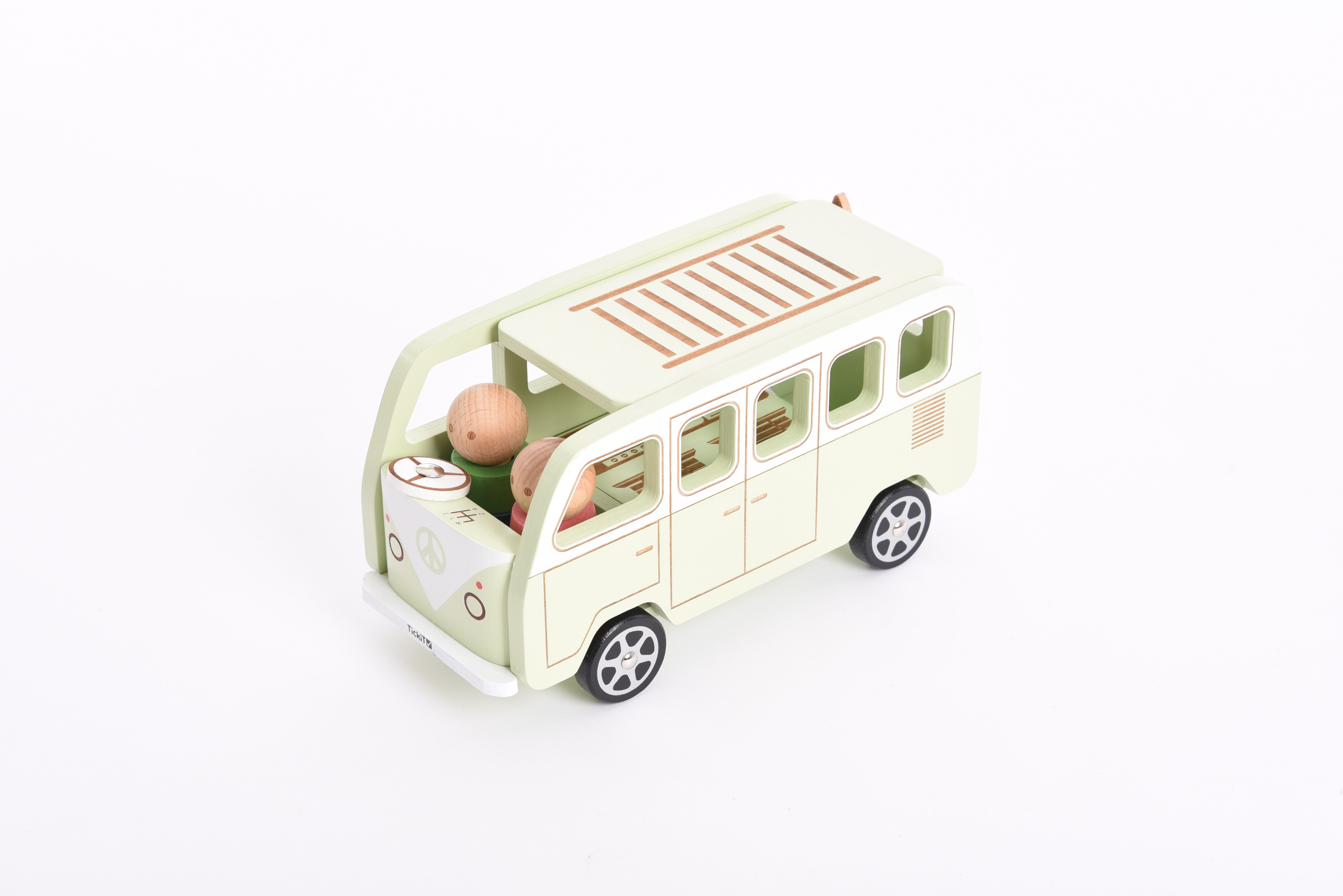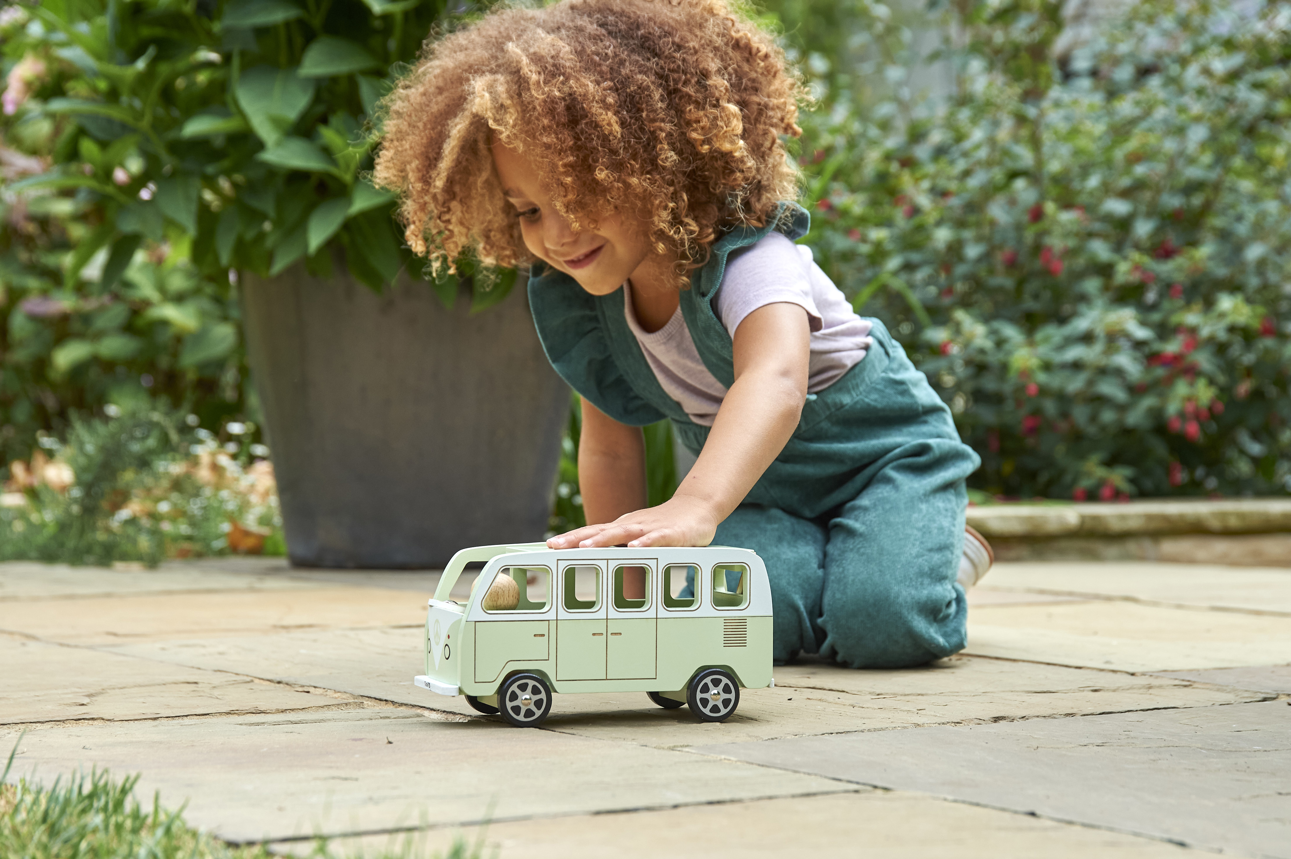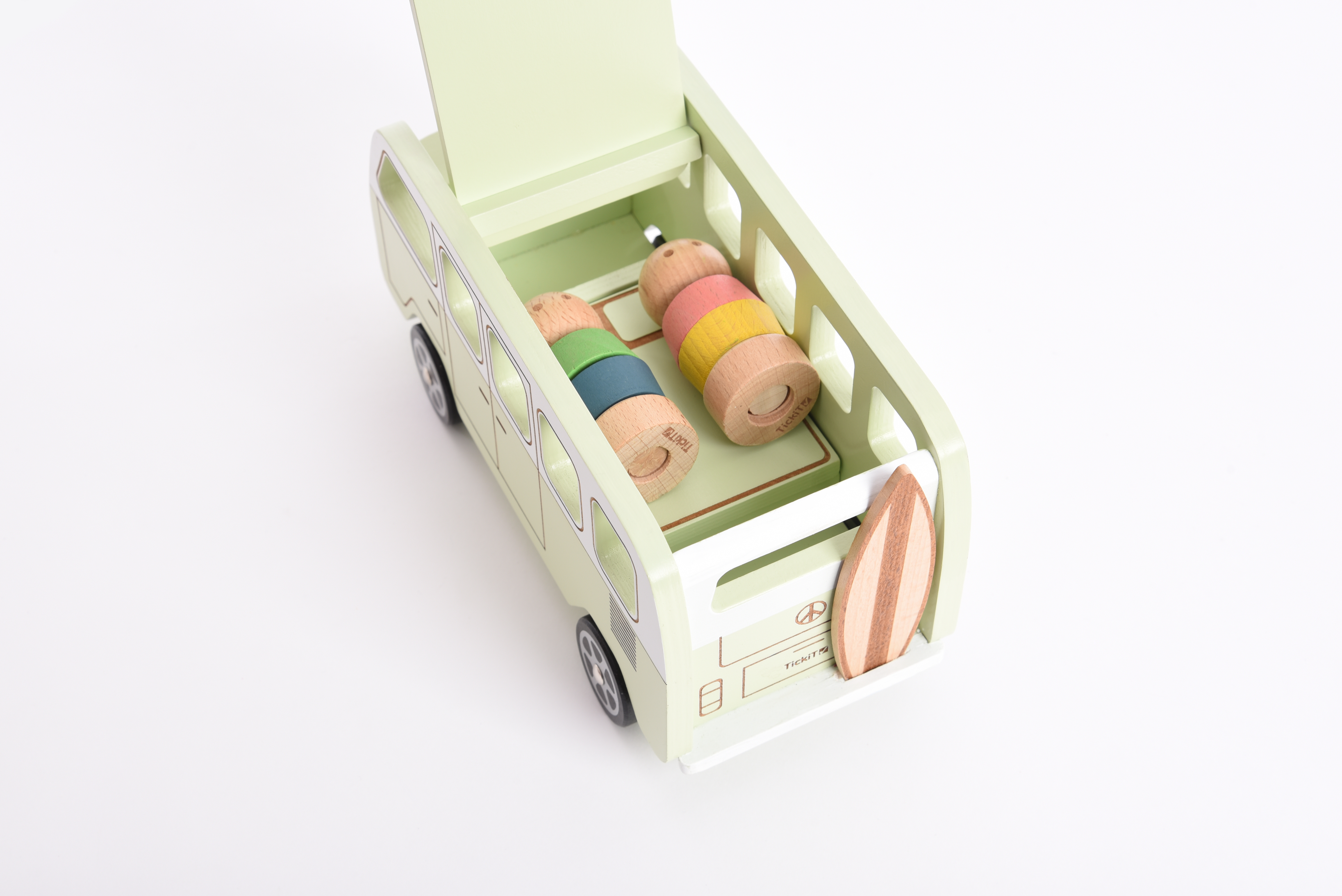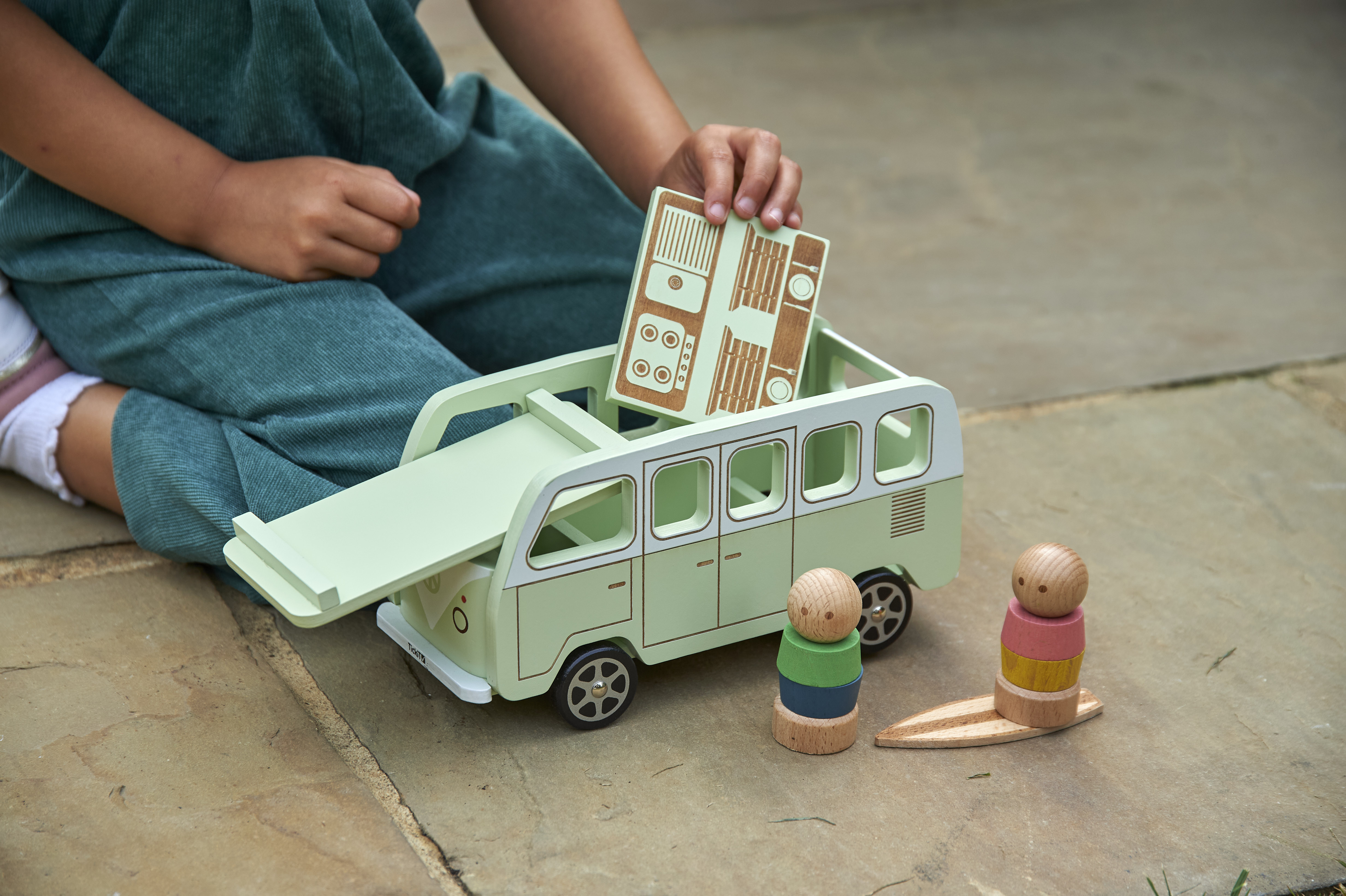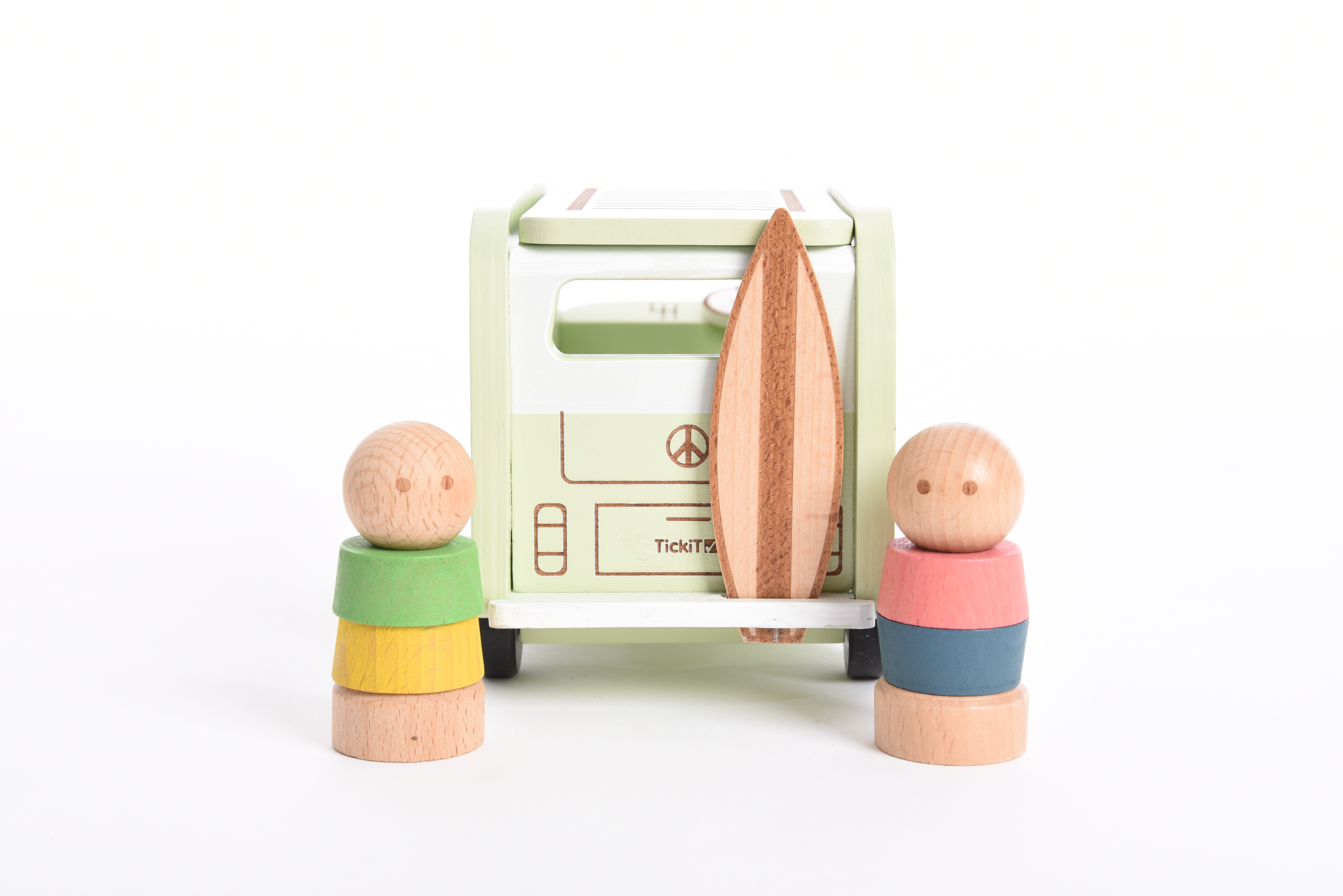 Der Camper wird aus Birkensperrholz und massivem Buchenholz hergestellt und verfügt über sensorische Laserdetails, Räder, einem Lenkrad, einem hochklappbarem Dach und einem doppelseitigen Bett-/ Küchenbereich. Zwei Spielfiguren, die individuell zusammengebaut werden können und ein Surfbrett lassen die Abenteuer noch größer werden.