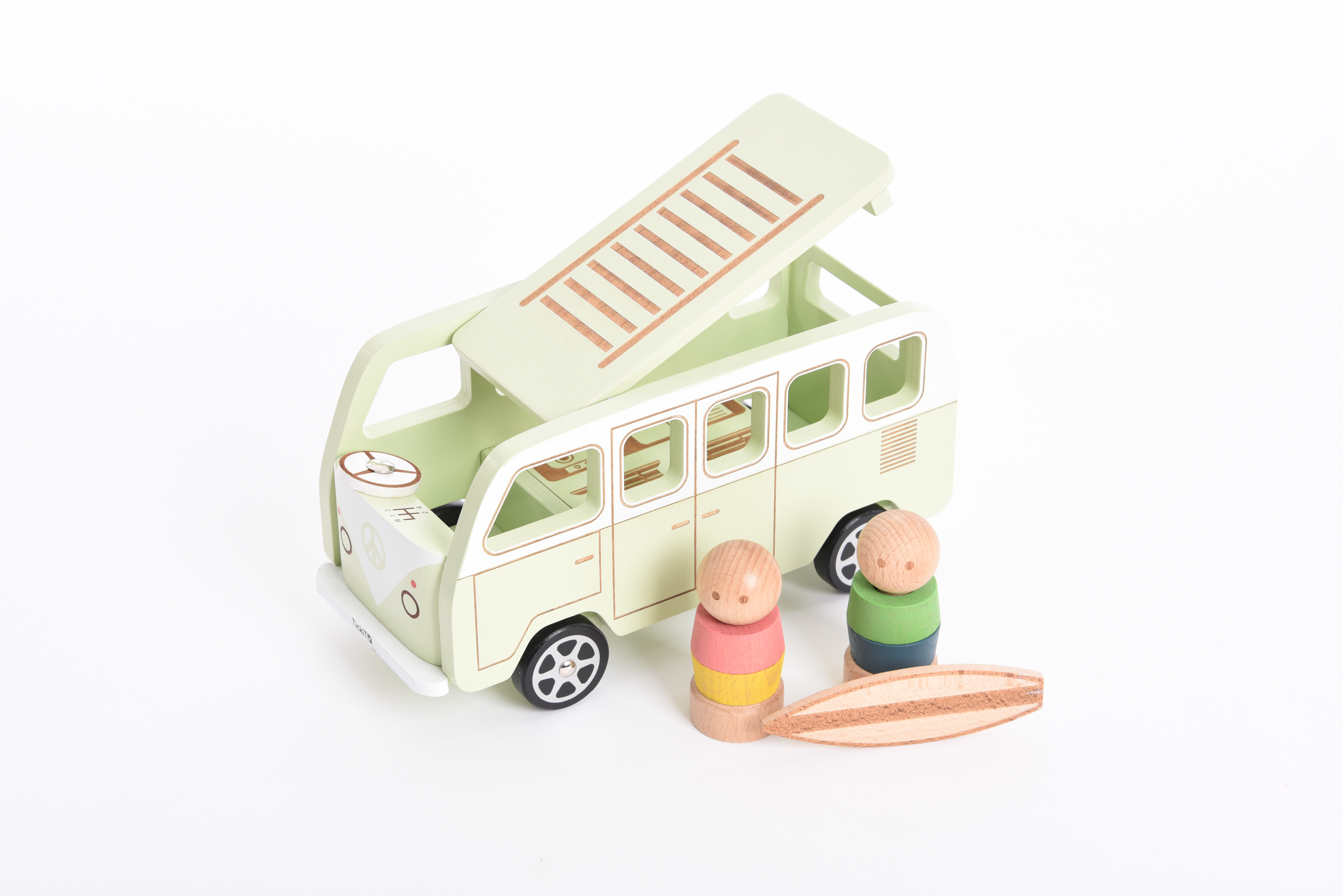 Inhalt: Wohnmobil aus Holz, 2 Spielfiguren, abnehmbarer Bett-/ Küchenbereich, ein Surfbrett