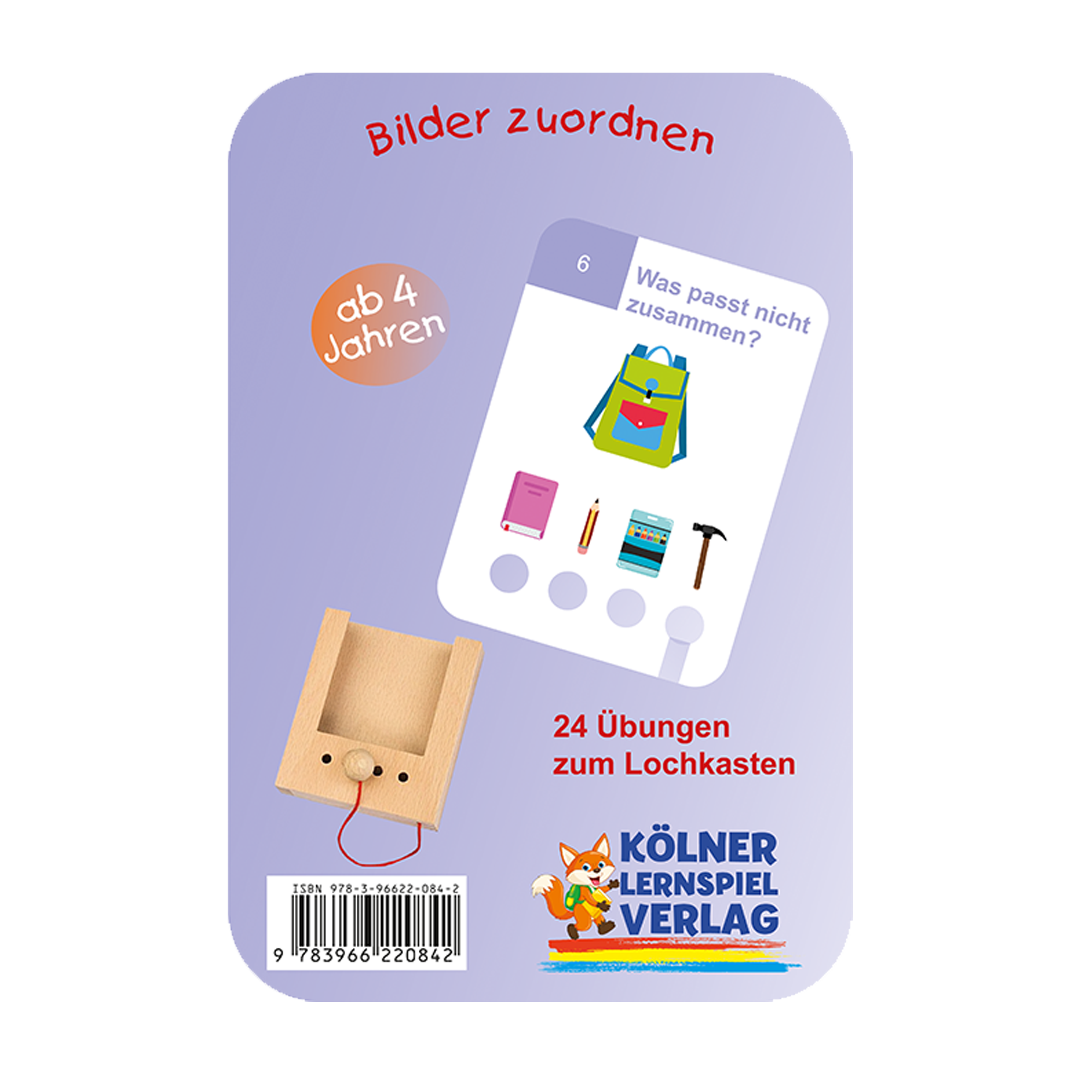 Das Kartenset "Bilder zuordnen" enthält 24 Übungen, bei denen verschiedene Bilder, Figuren und Kontexte miteinander in Beziehung gesetzt werden müssen. Durch diese spielerischen Aufgaben werden die kognitiven Fähigkeiten gefördert. Der Schwierigkeitsgrad steigt mit jeder Aufgabe, was es zu einem anregenden Lernerlebnis macht.