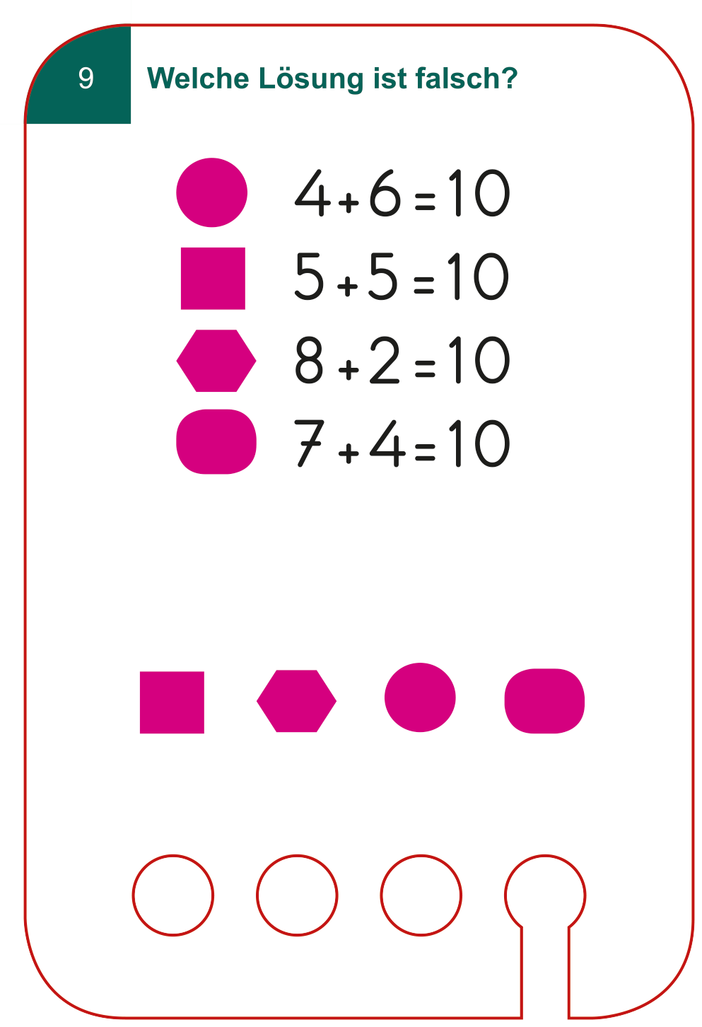 Zuerst werden die Aufgabenkarten in den Lochkasten geschoben. Dann wird der Holzstift zur Antwort ins Loch gesteckt. Ist die Antwort richtig, kann die Karte herausgezogen werden. Ist die Antwort falsch bleibt die Karte im Lochkasten stecken.