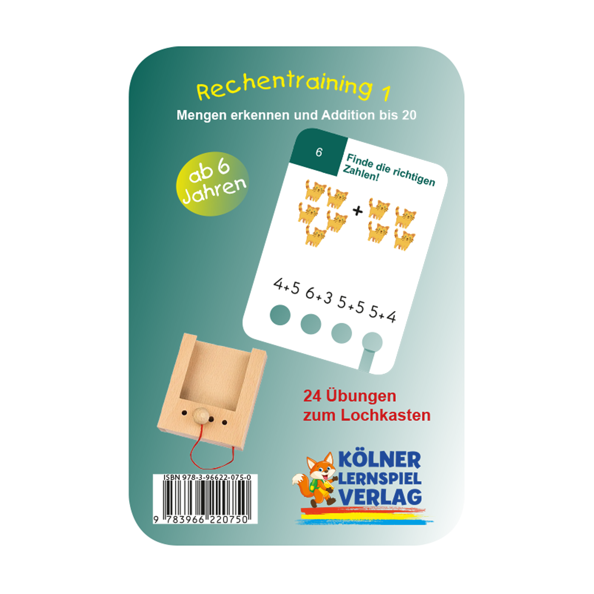 Dieses Kartenset für den Lochkasten bietet eine gezielte Förerung von Mengenverständnis und Addition bis 20 ab 6 Jahren. In 24 Übungen wird spielerisch an das Rechnen herangeführt und das Kind kann damit seine mathematischen Fähigkeiten stärken. Zur förderung der Motivation sind die Übungen ansprechend gestaltet und abwechslungsreich. Die Schwierigkeit der Aufgaben steigt mit der Kartenzahl, was es zu einer spannenden Herausforderung macht.