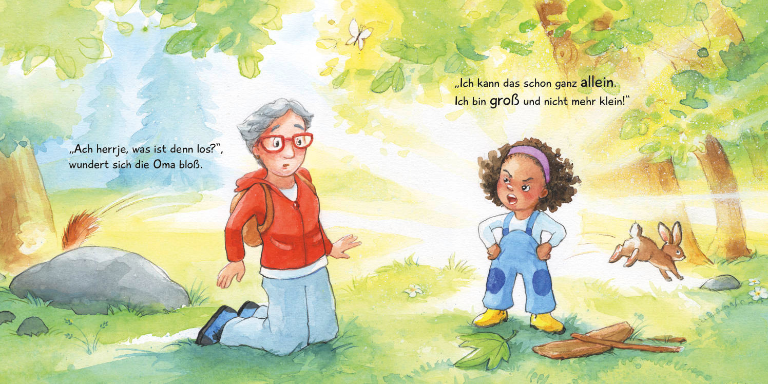 In Reimen und aus Sicht des Kindes wird eine kleine Geschichte erzählt, in der die Oma empathisch und zugewandt bleibt.
