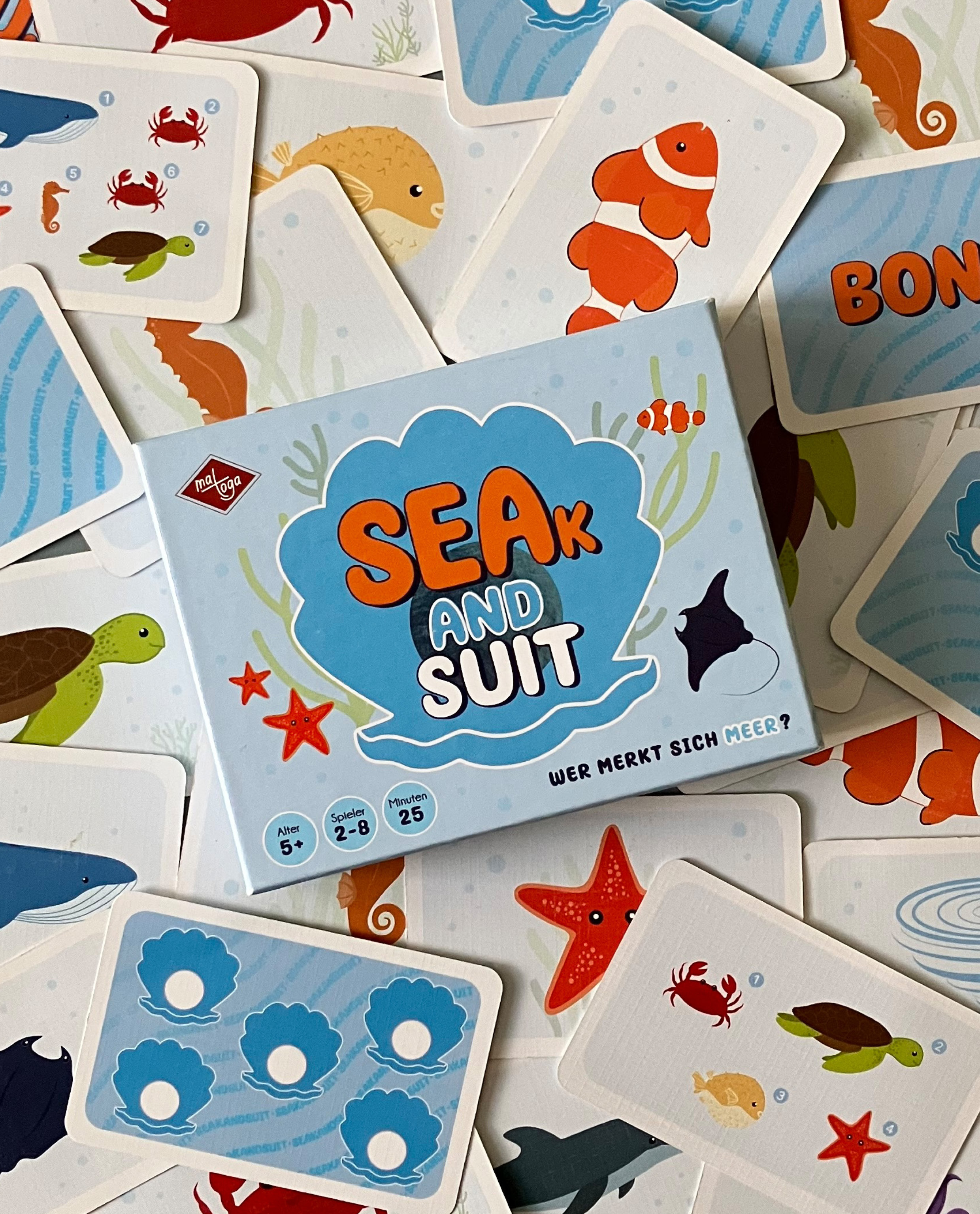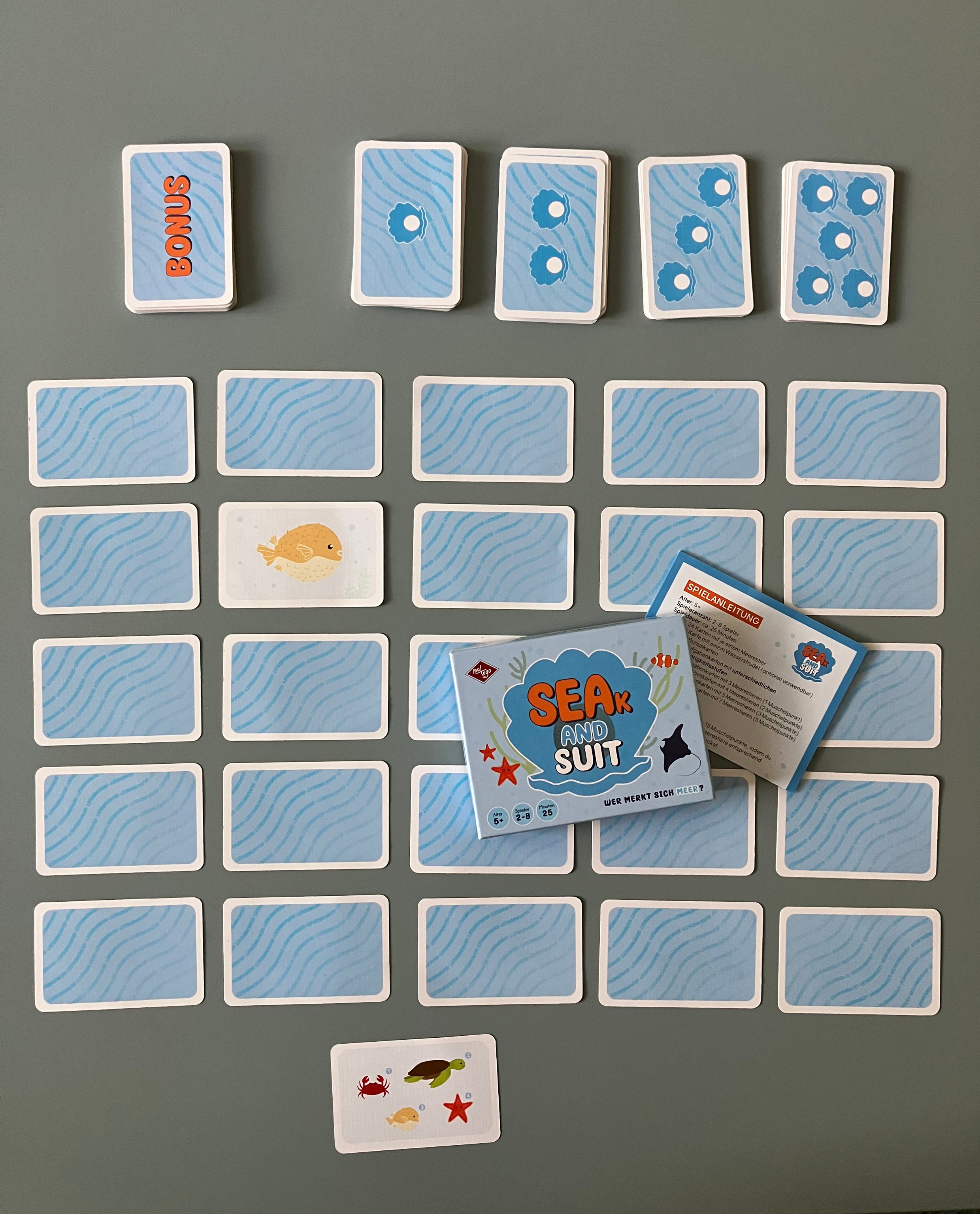 Inhalt: 24 Karten mit je einem Meerestier, 1 Karten mit einem Wasserstrudel, 18 Bonuskarten, 67 Aufgabenkarten mit unterschiedlichen Schwierigkeitsstufen
