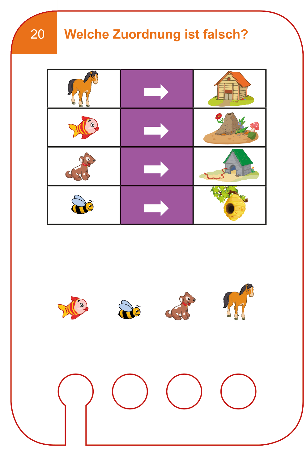 Zuerst werden die Aufgabenkarten in den Lochkasten geschoben. Dann wird der Holzstift zur Antwort ins Loch gesteckt. Ist die Antwort richtig, kann die Karte herausgezogen werden. Ist die Antwort falsch bleibt die Karte im Lochkasten stecken.